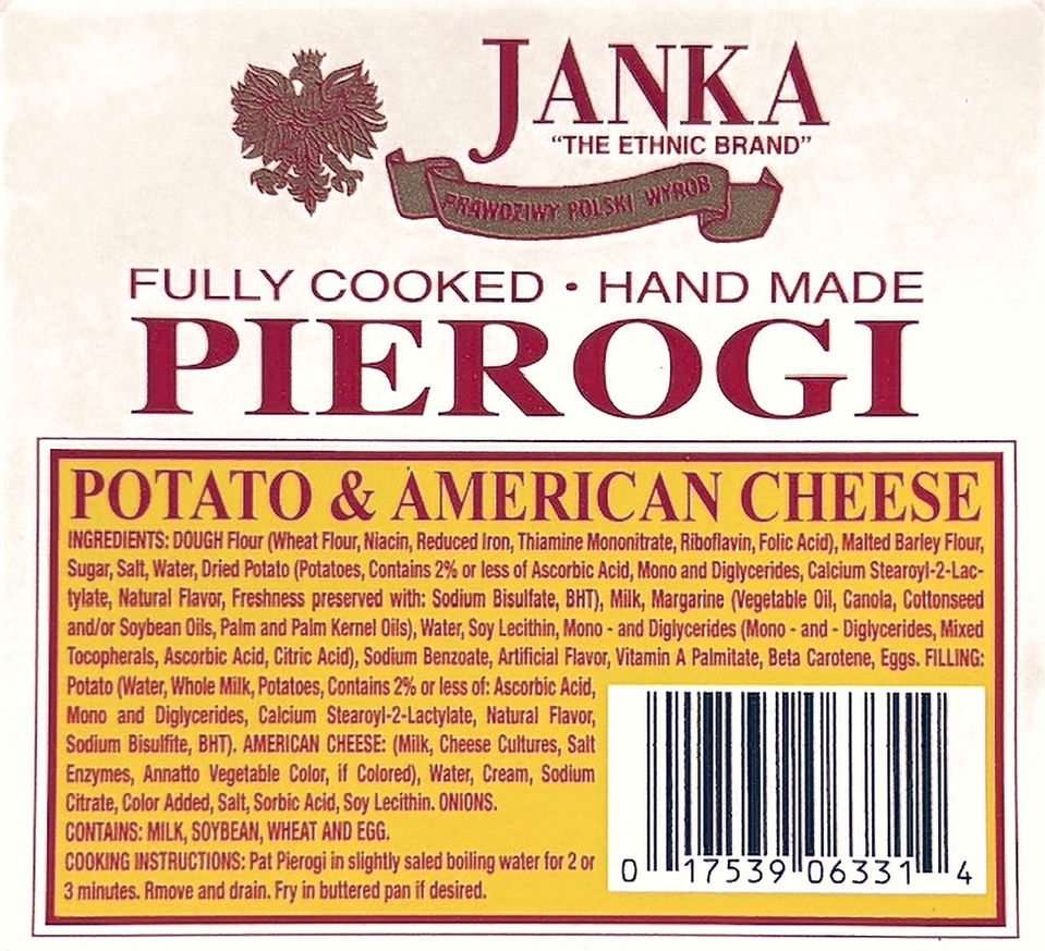 POTATO & AMERICAN CHEESEINGREDIENTS: DOUGH Flour (Wheat Flour, Niacin, Reduced Iron, Thiamine Mononitrate, Riboflavin, Folic Acid), Malted Barley Flour, Sugar, Salt, Water, Dried Potato (Potatoes, Contains 2% or less of Ascorbic Acid, Mono and Diglycerides, Calcium Stearoyl-2-Lac-tylate, Natural Flavor, Freshness preserved with: Sodium Bisulfate, BHT), Milk, Margarine (Vegetable Oil, Canola, Cottonseed and/or Soybean Oils, Palm and Palm Kernel Oils), Water, Soy Lecithin, Mono - and Diglycerides (Mono - and - Diglycerides, Mixed Tocopherals, Ascorbic Acid, Citric Acid), Sodium Benzoate, Artificial Flavor, Vitamin A Palmitate, Beta Carotene, Eggs. FILLING:Potato (Water, Whole Milk, Potatoes, Contains 2% or less of: Ascorbic Acid, Mono and Diglycerides, Calcium Stearoyl-2-Lactylate, Natural Flavor, Sodium Bisulfite, BHT). AMERICAN CHEESE: (Milk, Cheese Cultures, Salt, Enzymes, Annatto Vegetable Color, if Colored), Water, Cream, Sodium Citrate, Color Added, Salt, Sorbic Acid, Soy Lecithin. ONIONS.CONTAINS: MILK, SOYBEAN, WHEAT, AND EGG.COOKING INSTRUCTIONS: Pat Pierogi in slightly salted boiling water for 2 or 3 minutes. Remove and drain. Fry in a buttered pan if desired.0 17539 06331 4CODE A-5(IF FROZEN, THAW IN REFRIGERATOR) NET WT. 1 LBKEEP REFRIGERATED OR FROZENMADE BYKRUSINSKICLEVELAND, OHIO 44105
